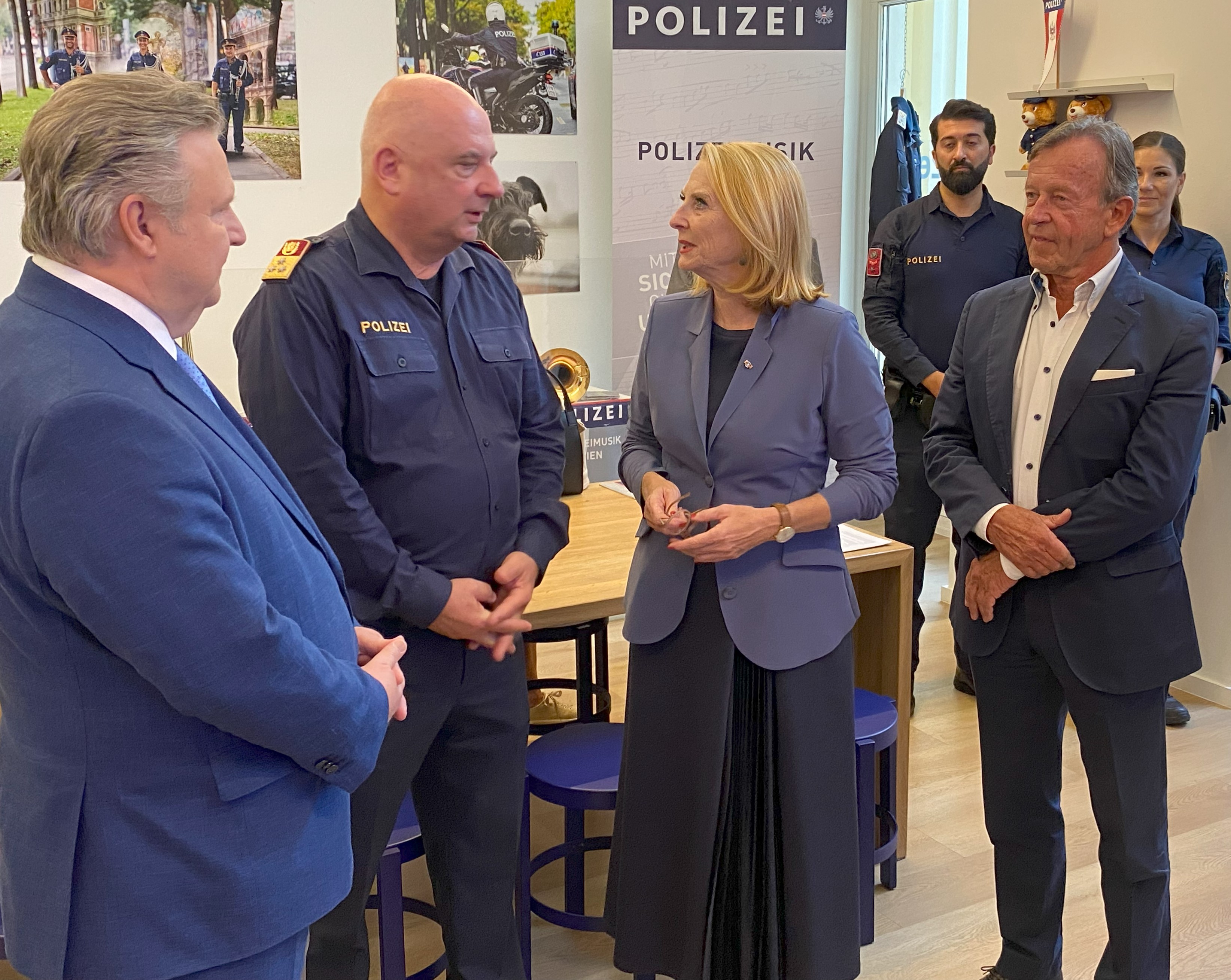 Unterstützt wird diese Argumentation von Dienstvollzugsleiter Oberst Peter Seidl, BA: "Pro Jahr bewältigen wir 1,5 Millionen Notrufe und rund 400.000 Einsätze!" Interessiert an den Angeboten im Store wie VR-Brille, Info-Screen und Ausstellungen über die Aufgabengebiete der einzelnen Abteilungen der Wiener Polizei zeigte sich auch LAbg. Gemeinderat Christian Hursky, Sicherheitssprecher der SPÖ Wien. Vereinspräsident KR Karl Javurek, Generalsekretärin Erika Gramann-Bettstein, MBA sowie die Vorstandsmitglieder Dr. Franz Kosyna und BezR André Stolzlechner standen für Infos über Konzeption und Gestaltung des Stores und den im Rahmen der Förderung angeschafften Kleinbus VW ID Buzz für Recruiting-Einsätze bei HR-Messen etc. zur Verfügung.
