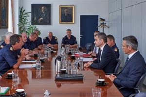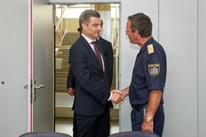 Der Innenminister traf mit Führungskräften der LPD Wien zusammen. Foto: LPD Wien/Karl SchoberLandespolizeipräsident Dr. Gerhard Pürstl und seine Führungskräfte begrüßten den neuen Innenminister und wiesen darauf hin, dass 70% der in ganz Österreich verzeichneten Aufgaben von der Wiener Polizei erledigt werden. "Umso wichtiger ist es, dass der Personalstand in Wien nicht durch Versetzungen in die Bundesländer sinkt und auch in Zukunft die konsequenten Aufnahmen für Wien gesichert sind", betonte Pürstl. Der Bundesminister lobte die Zusammenarbeit mit der Landespolizeidirektion Wien und sicherte seine Unterstützung zu. "Es ist mir ein besonderes Anliegen, dass die Polizistinnen und Polizisten die beste Ausrüstung bekommen und dass auch die Digitalisierung weiter voran getrieben wird", erklärte Peschorn bei seinem Besuch in der Landespolizeidirektion Wien. Der Verein der Freunde der Wiener Polizei wünscht dem neuen Innenminister viel Glück und Erfolg bei der Bewältigung der vor ihm liegenden Aufgaben!
