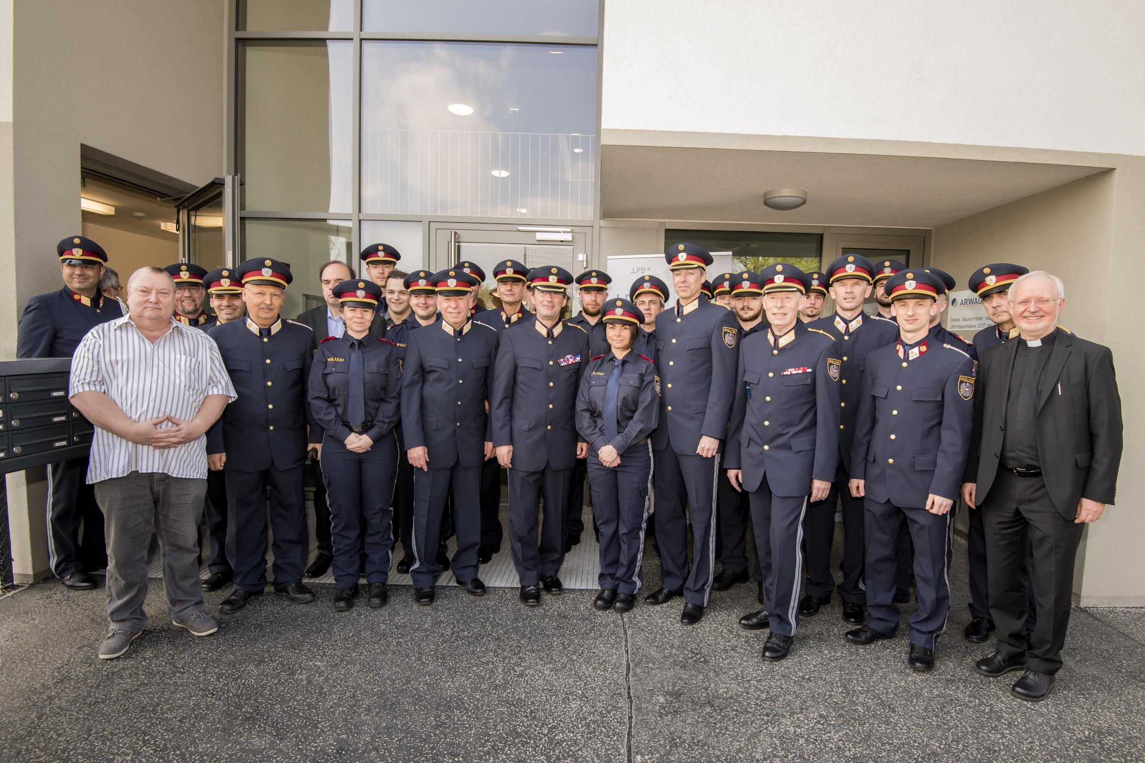 Landespolizeipräsident Dr. Gerhard Pürstl eröffnete die neue PI in Floridsdorf. Foto: LPD Wien/Dietmar Gerhartl-SinzingerBei strahlendem Wetter nahmen zahlreiche hochrangige Gäste an der Einweihung der neuen Polizeiinspektion teil, darunter Gruppenleiter General Reinhard Schnakl, Gemeinderat Christian Hursky, Nationalratsabgeordnete Angela Lueger, FPÖ-Sicherheitssprecher Gerhard Haslinger, Landespolizeipräsident Dr. Gerhard Pürstl, der Bezirksvorsteher von Floridsdorf Georg Papai sowie in Vertretung des Bestandgebers ARWAG Walter Aigner. Die Festredner zeigten sich von der modernen Polizeiinspektion beeindruckt und dankten den Kolleginnen und Kollegen für ihre hervorragende Arbeit. Der Pfarrer von Strebersdorf Mag. Franz Schuster, Bundeskoordinator Roman Dietler und Landesseelsorger Stefan Kunrath segneten die neue Dienststelle und überreichten dem Kommandanten Chefinspektor Martin Pessl ein Kreuz für die neue Dienststelle. Schwungvoll umrahmt wurde die Feierlichkeit von der Polizeimusik Wien.