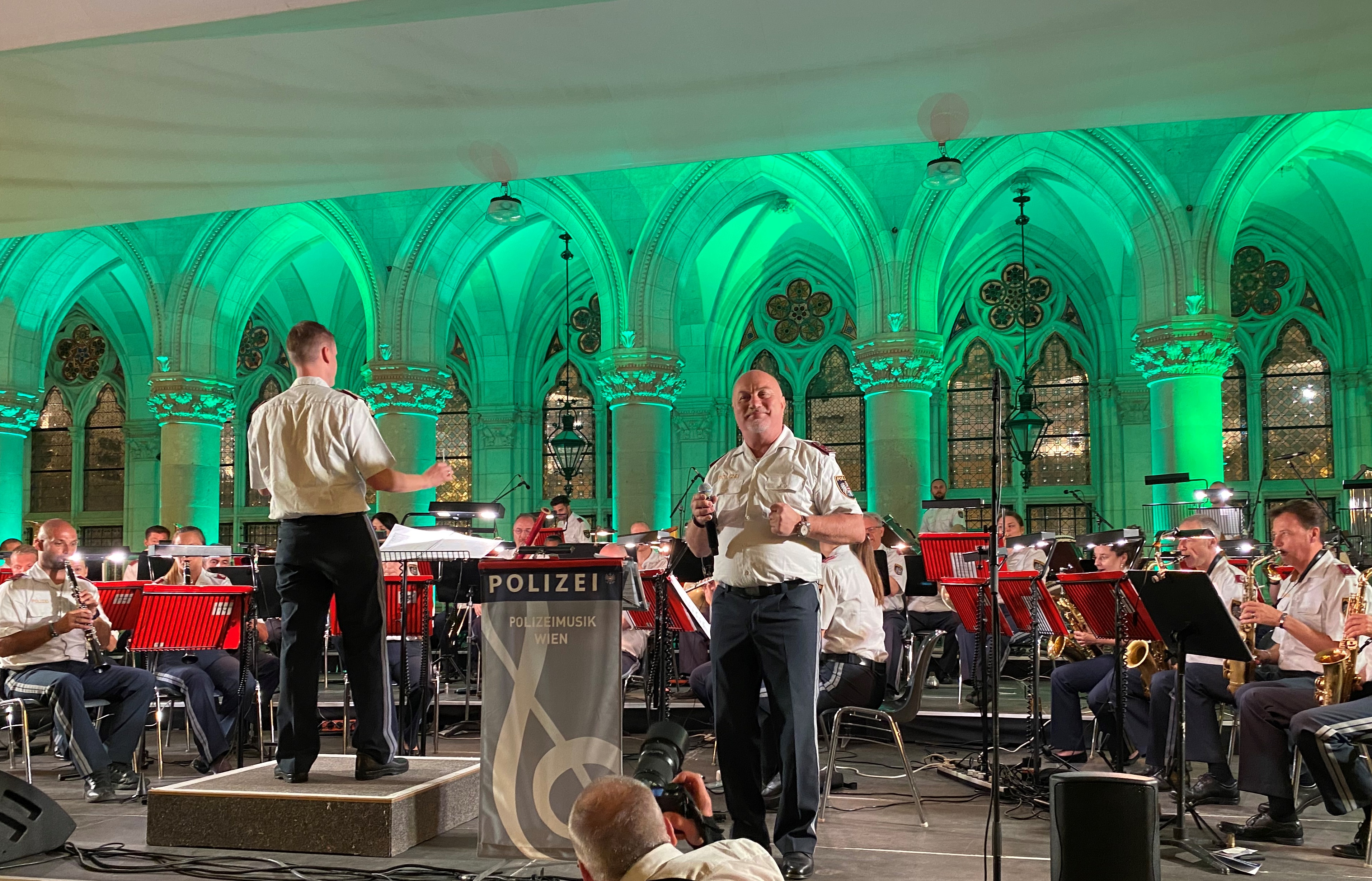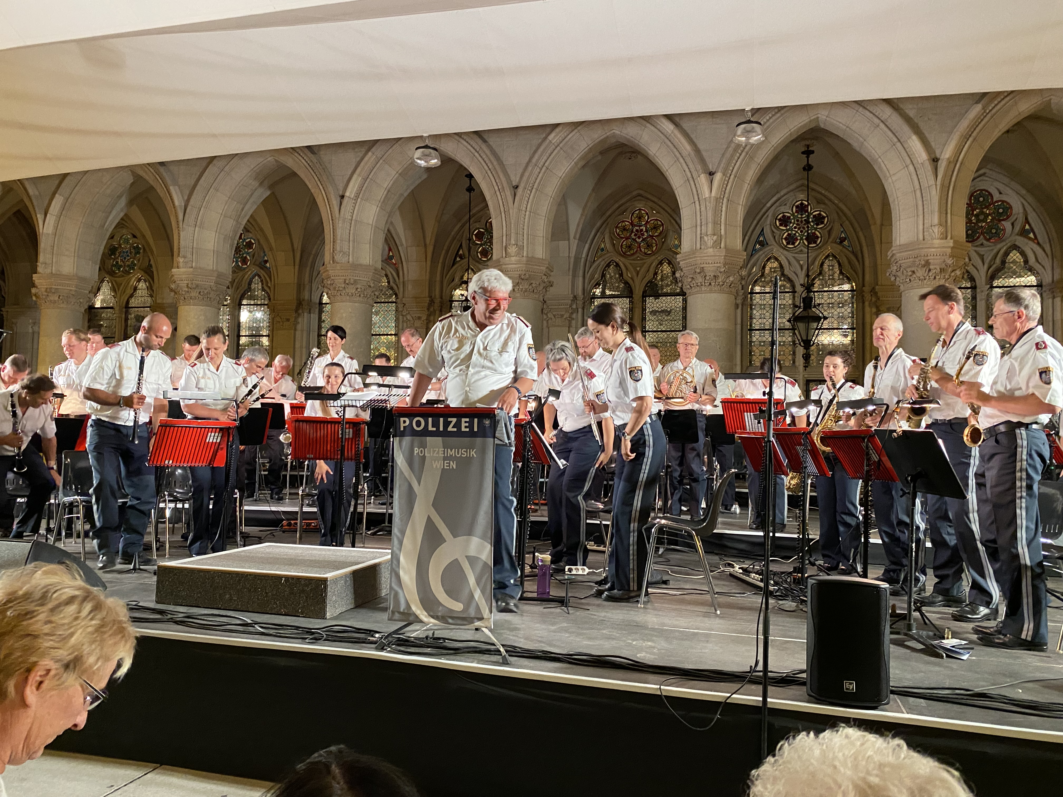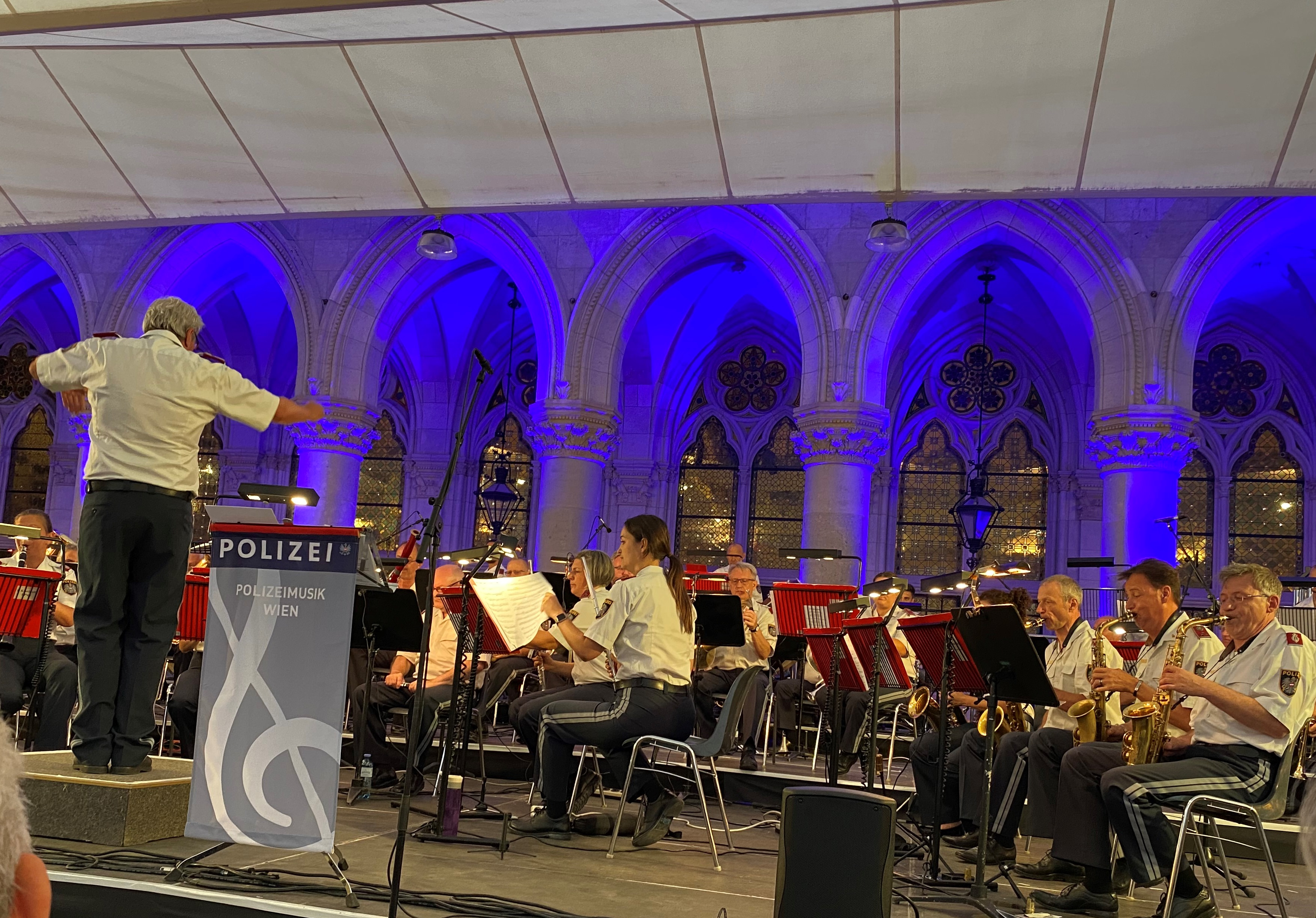 Unter der Leitung von Kapellmeister Herbert Klinger und Stefan Gottwald, garniert mit  Gastauftritten von Marlene Pregesbauer (Querflöte und Gesang) und Stefan Bleiberschnig (Gesang) erklangen die eindrucksvollen musikalischen Untermalungen u. a. zu "Grease", "Jurassic Park" und "Ratatouille" im wunderschönen Rathaus-Arkadenhof. Weil laut Klinger "die Durchführung einer derartigen Veranstaltung stetig steigende Kosten verursacht", sei man auf Freunde und Sponsoren angewiesen, "die uns bei der Realisierung dieses Projektes unterstützen". Denn der Eintritt ist frei - und alles Geld, das durch freiwillige Spenden und Sponsorbeiträge zusammen kommen und die Veranstaltungskosten übersteigen, kommen  einem sozialen Zweck innerhalb der Polizei zugute. Das schon traditionelle Sponsoring in Höhe von 1.500 Euro leistet der Verein der Freunde der Wiener Polizei gerne, gilt doch dieses Konzert seit vielen Jahren als schwungvolles Bindeglied zwischen der Wiener Bevölkerung und der Polizei. Den musikalischen Ohrenschmaus genossen die Vorstandsmitglieder Erika Gramann-Bettstein, MBA, Mag. Peter Gross und Mag. Wolfgang Hammerer