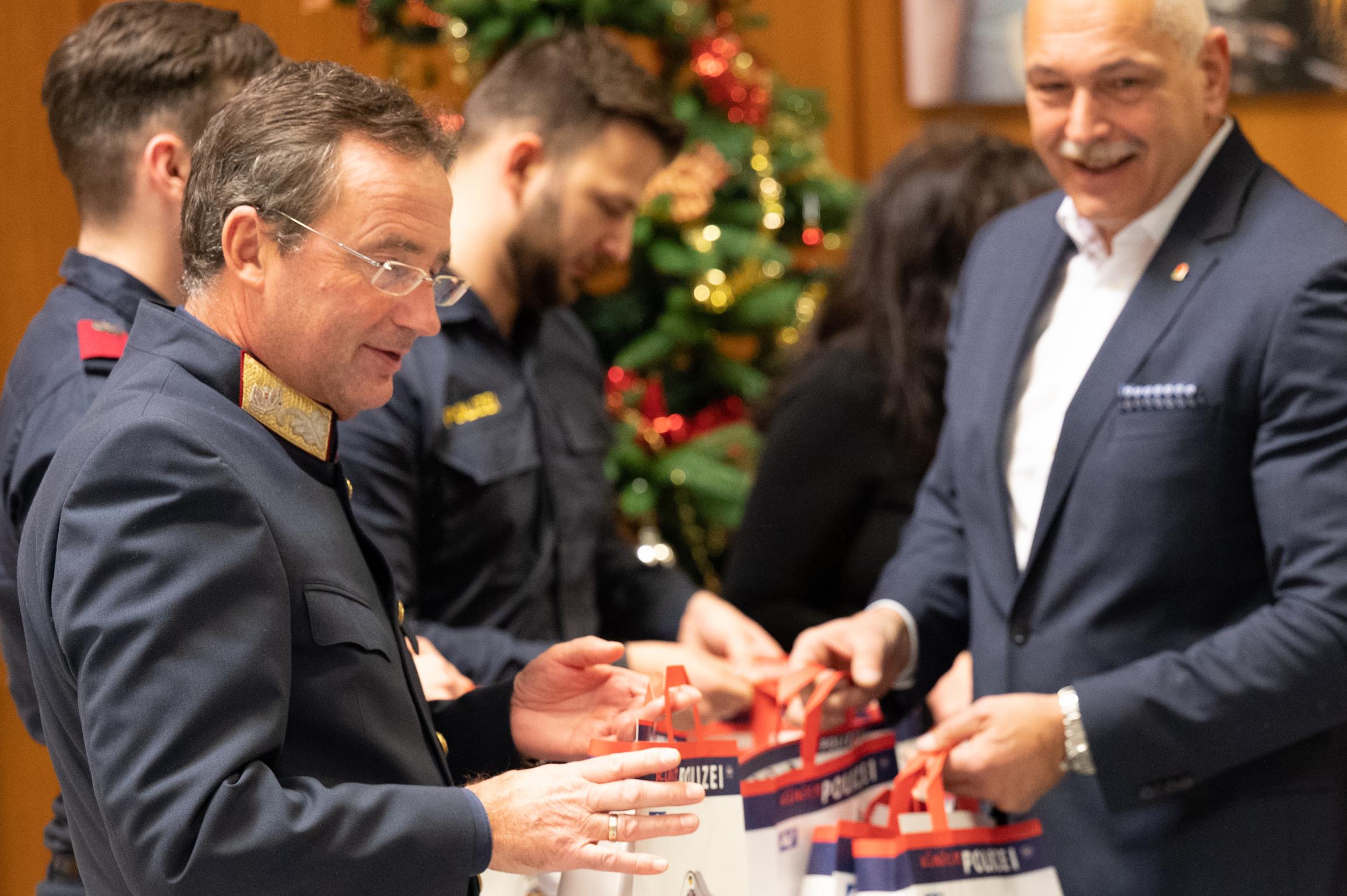Für die Wiener SOS Kinderdörfer wurden auf Vermittlung der "Polizeifreunde" 3.000 Euro gespendet. Foto: LPD Wien/Thomas CernyDie Feststunde für die rund 30 Kinder aus dem SOS Kinderdorf in Wien-Floridsdorf am 19. Dezember 2022 im Festsaal der Landespolizeidirektion begann mit Weihnachtsliedern, die von einem Quartett der Polizeimusik Wien gespielt wurden und zum fröhlichen Mitsingen einluden. Zum Gaudium der Kleinen traten Clown Poppo und Polizeibär Tommy auf, viele Streicheleinheiten heimste Diensthund "Sugar" ein, der zeigte, welche Kunststücke er gelernt hat. Ein Höhepunkt der Feier folgte, als Landespolizeipräsident Dr. Gerhard Pürstl eine stimmungsvolle und lustige Weihnachtsgeschichte vorlas. Zu guter Letzt überreichte Direktor Dr. Alexander Kiss von ÖWD security & services auf Vermittlung des Vereins der Freunde der Wiener Polizei einen Spendenscheck in Höhe von 3.000 Euro zugunsten der Wiener SOS-Kinderdorfeinrichtungen.