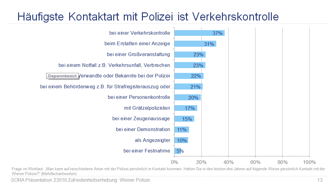 37% der Wiener:innen sind im Rahmen einer Verkehrskontrolle und 31% beim Erstatten einer Anzeige in den letzten drei Jahren mit der Polizei in Kontakt gekommen. Jeweils 23% hatten bei einer Großveranstaltung oder wegen eines Notfalls wie Verkehrsunfall oder Verbrechen Kontakt mit der Polizei. 22% hatten Kontakt über Verwandte oder Bekannte bei der Polizei, 21% bei einem Behördenweg, 17% mit einem Grätzelpolizisten.