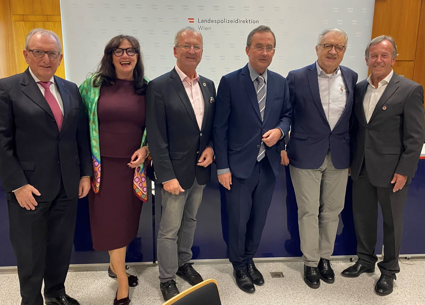 Die Vorstandsmitglieder Dr. Franz Kosyna, Erika Gramann-Bettstein und Mag. Josef Koppensteiner mit Landespolizeipräsident Dr. Gerhard Pürstl, Referent Dr. Wolfgang Petritsch und