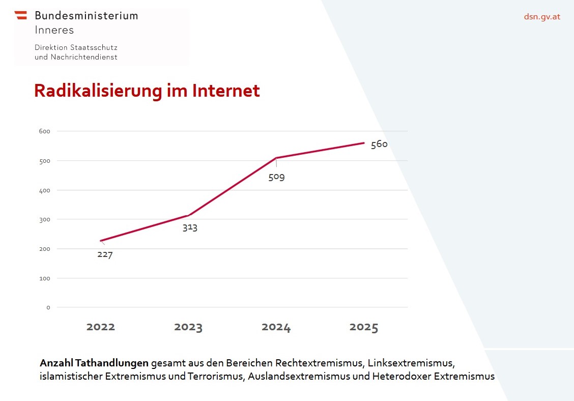 "Die Radikalisierung im digitalen Raum stellt eine der größten sicherheitspolitischen Herausforderungen unserer Zeit dar. Seit 2022 hat sich die Radikalisierung im Internet mehr als verdoppelt", wie Staatssekretär Mag. Jörg Leichtfried ausführt: "Extremistische Akteurinnen und Akteure nutzen gezielt soziale Medien und digitale Plattformen, um Jugendliche und sogar Kinder zu manipulieren, zu vereinnahmen und in radikale Netzwerke einzubinden. Wir brauchen für die Zukunft eine klare strategische Herangehensweise gegen Extremismus und Radikalisierung, die frühzeitig erkennt, isoliert und entgegenwirk!"