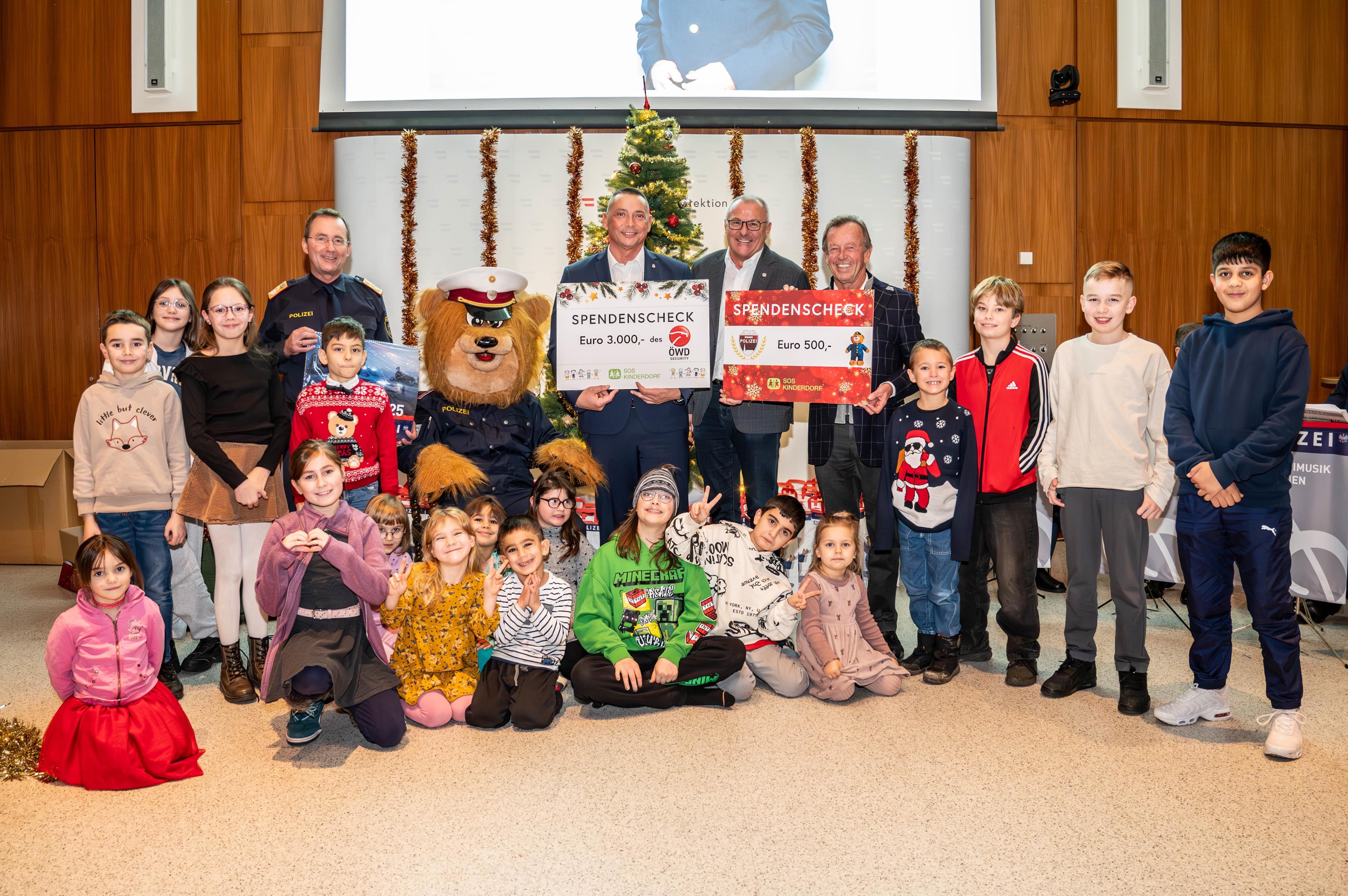 Neben reichlich gefüllten Kinderpolizei-Sackerln freute sich ganz besonders der Leiter der SOS-Kinderdörfer Wiens, Erwin Roßmann, über großzügige Geldspenden des ÖWD und des Vereins der Freunde der Wiener Polizei. Auch die ÖWD-Spende hat bereits Tradition und wird seit Jahren über den Polizeifreunde-Verein vermittelt. Vereinspräsident KR Karl Javurek übergab dazu namens des Vereins einen symbolischen Spendenscheck über 500 Euro. Für den musikalischen Rahmen der spannenden Weihnachtsfeier sorgte die Polizeimusik Wien und der Landespolizeipräsident richtete ganz persönliche Weihnachtsworte an die Kinder. Alle Beteiligten freuen sich schon jetzt auf ein Wiedersehen 2025.