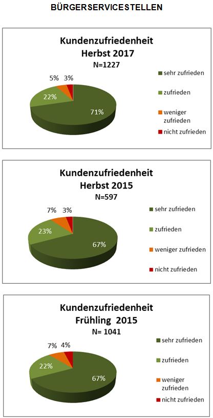 Die Ergebnisauswertung hat gezeigt, dass die Bürgerinnen und Bürger zu 93% mit dem Bürgerservice zufrieden sind. Gegenüber der Umfrage vom Herbst 2015 ist ein Anstieg der Kundenzufriedenheit um 3%, gegenüber der Erhebung vom Frühling 2015 sogar um 4% zu verzeichnen.