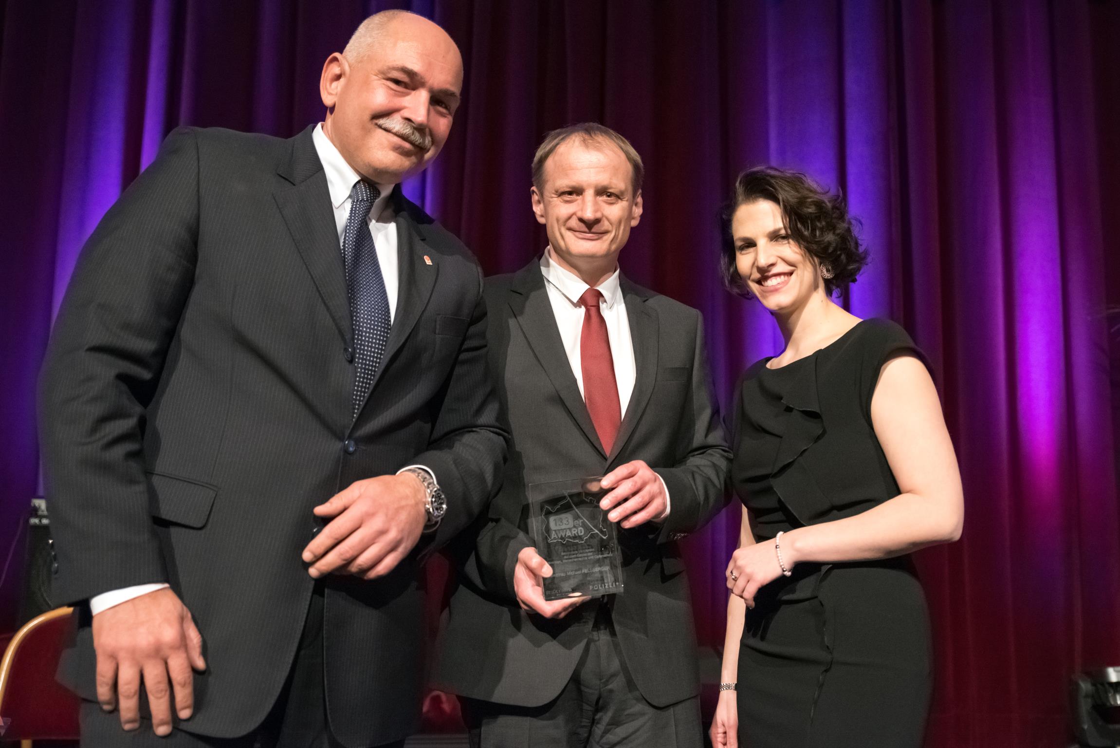 Landespolizeipräsident Dr. Pürstl (r.) gratulierte den ausgezeichneten Polizeikräften. Foto: LPD Wien/ElbeSeit 2009 werden im Rahmen des „133er Award“ im Wiener Rathaus Wiener Polizistinnen und Polizisten für besondere Leistungen ausgezeichnet. Der Beruf des Polizisten sei "kein gewöhnlicher Beruf", der immer wieder "die Bewältigung von schwierigen Situationen" erfordere, sagte Landespolizeipräsidenten Dr. Gerhard Pürstl, der den Polizistinnen und Polizisten, aber auch dem österreichischen Bundesheer für dessen Assistenzleistungen dankte. Nominiert waren Polizistinnen und Polizisten für 6 Kategorien des Awards. Über die Internetseite der Kronen Zeitung konnten Leserinnen und Leser den Gewinner bzw. die Gewinnerin in der Kategorie "Polizist/in des Jahres" direkt wählen, in den anderen Kategorien wurden die Gewinner von einer Jury ermittelt.