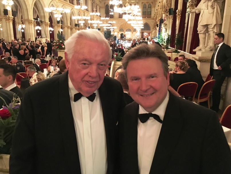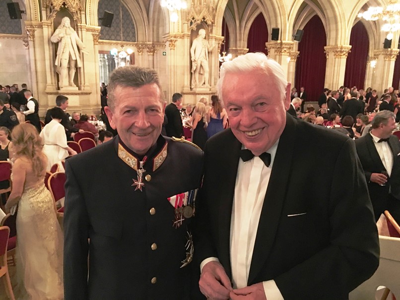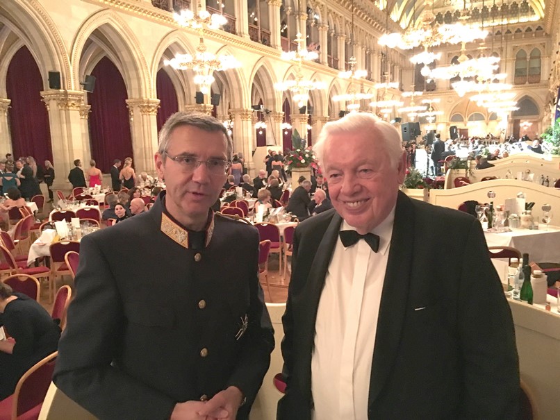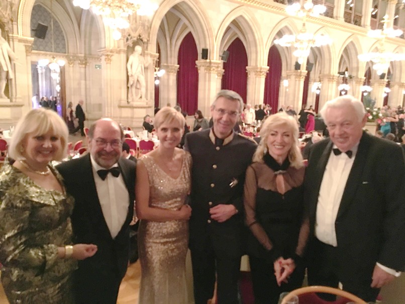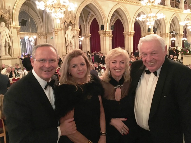 Vereinspräsident Wala (l.) begrüßte Bürgermeister Dr. Ludwig und Landesparteisekretärin Novak (2.v.l.) in der Rathaus-Loge.Die feierliche Eröffnung des Wiener Polizeiballs übernahmen das Jungdamen- und Jungherrenkomitee des BM.I Bildungszentrums Wien mit Unterstützung durch Paare aus Wiener Rettungsorganisationen unter der Leitung von Bernd Erblich von der Tanzschule Elmayer-Vestenbrugg. Die Big Band und das Ballstreichorchester der Polizeimusik Wien übernahmen die musikalische Begleitung. Ein Highlight war Stargast Waltraud Haas mit ihrer Gesangseinlage "Adieu, mein kleiner Gardeoffizier" von Robert Stolz. Der Vorstand der LPD-Öffentlichkeits-arbeit, Hofrat Mag. Manfred Reinthaler, begrüßte anschließend die zahlreichen Ehrengäste, darunter Vizekanzler Heinz-Christian Strache, Bundesminister für Inneres Herbert Kickl, Bundesminister für EU, Kunst, Kultur und Medien Mag. Gernot Blümel, Staatssekretärin Mag. Karoline Edtstadler, sowie hohe Vertreter der Stadt Wien, des Bundesministeriums für Inneres und der Landespolizeidirektion Wien wie u. a. Landespolizeivizepräsident General Dr. Michael Lepuschitz, M.A. Auch der Präsident des Vereins der Freunde der Wiener Polizei, Adolf Wala, wurde namentlich begrüßt.