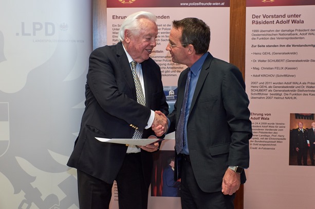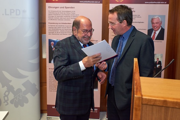 Den beiden Geehrten fehlten ob der überraschenden Ehrung ein bisschen die Worte. Vereinspräsident Wala verwies bei seinem Dank aber ebenso auf die hervorragende Zusammenarbeit in den beiden Dekaden unter seiner Vereinsführung – und stellte ein neuerliches Großprojekt zur Unterstützung der Wiener Polizistinnen und Polizisten in Kooperation mit der Stadt Wien noch für dieses Jahr in Aussicht: „Schließlich war und ist es unser gemeinsames Anliegen, mit allen Aktivitäten für die Polizei die Sicherheit in Wien zu fördern!“