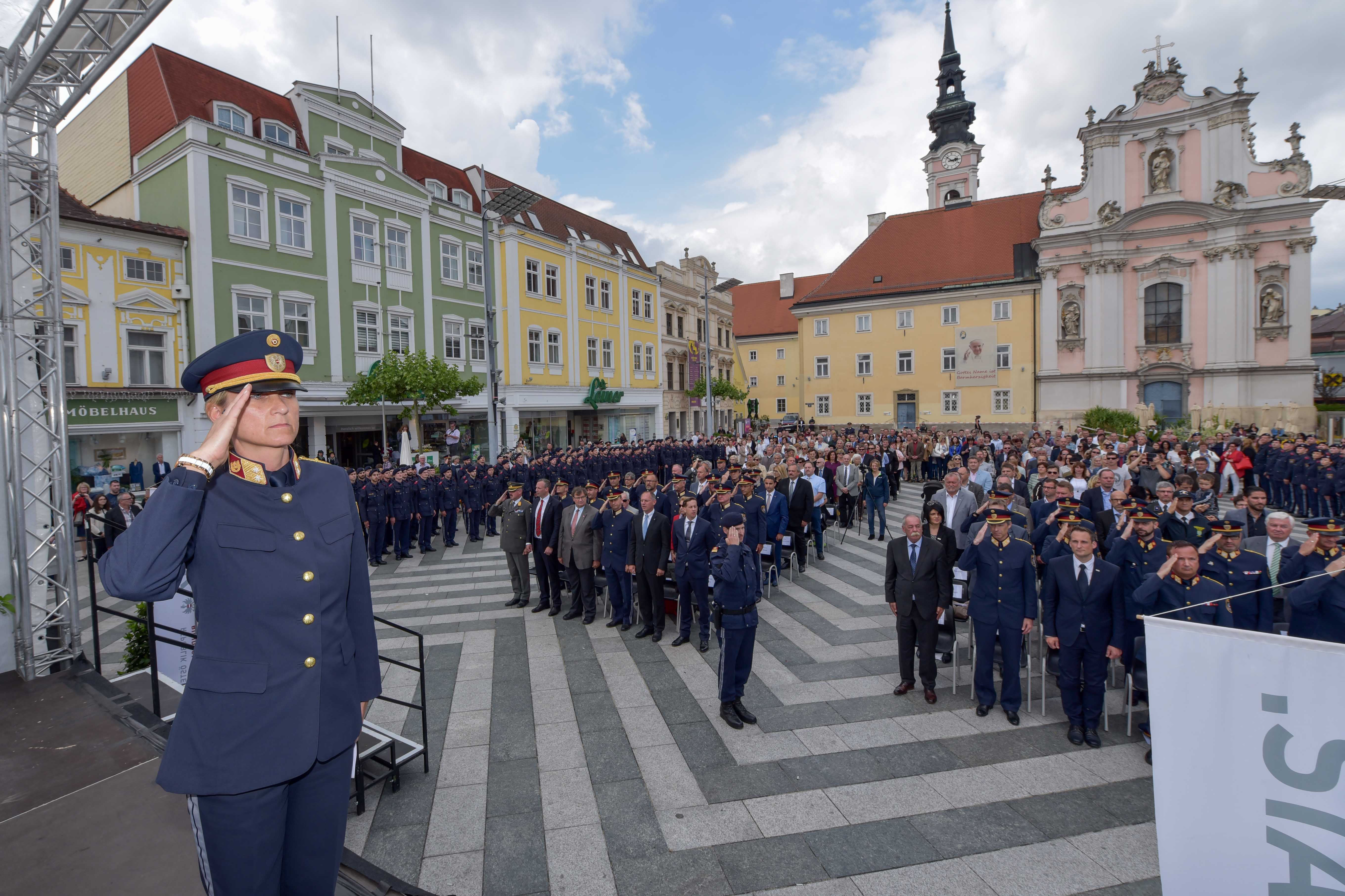 Die PolizistInnen wurden in jenen Gesetzesmaterien ausgebildet, die für den Grenzschutz wichtig sind. Foto: LPD NÖ/HöllerMotiviert, ehrgeizig und engagiert – das sind die 55 Nachwuchspolizistinnen und 130 Nachwuchspolizisten, die am 16. Mai 2018 den Abschluss ihrer Grundausbildung begingen. Am Rathausplatz in St. Pölten feierten mit ihnen der niederösterreichische Landespolizeidirektor Mag. Mag. (FH) Konrad Kogler und Kabinettchef Ing. Mag. Reinhard Teufel.