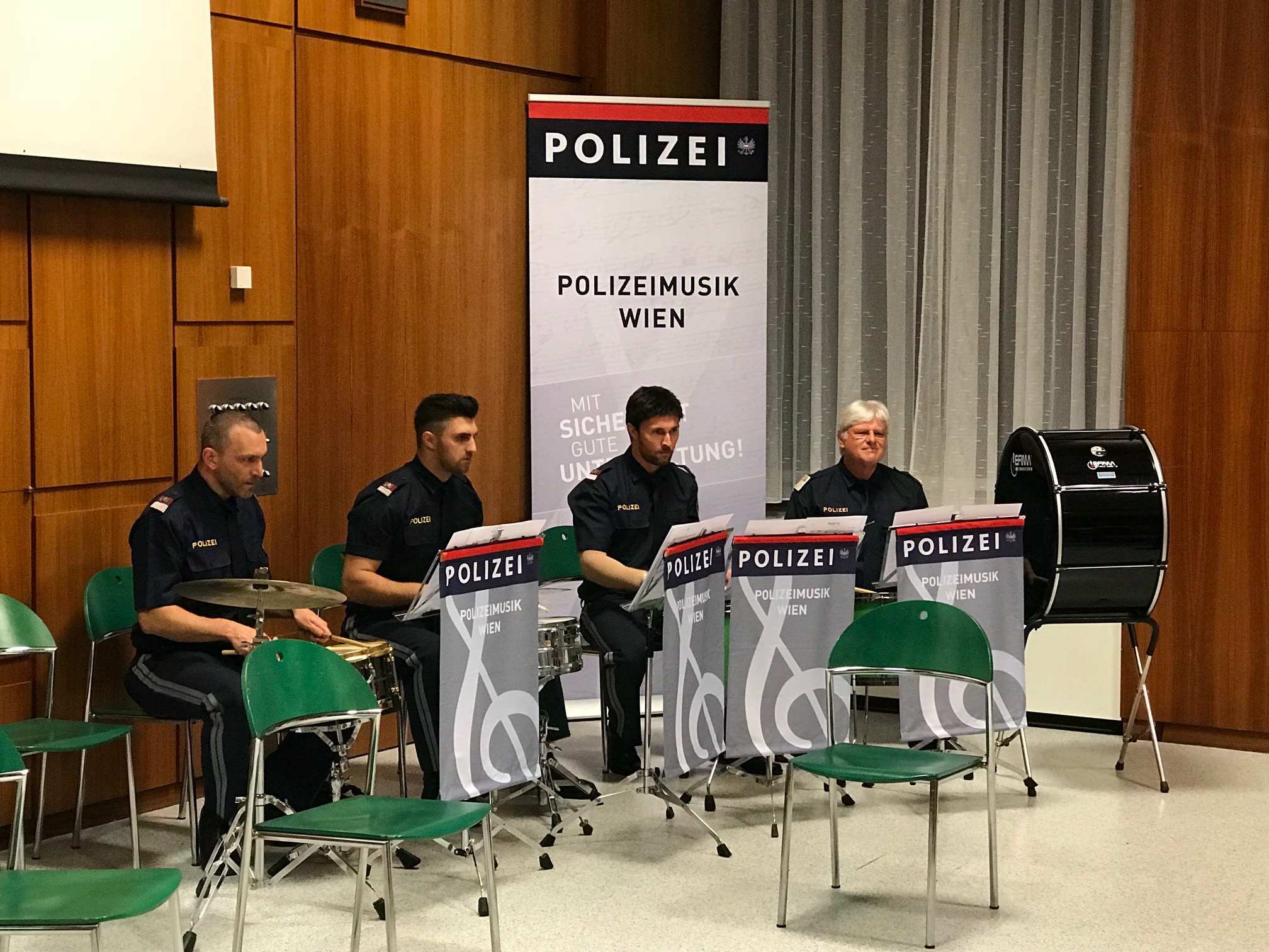 Die Polizeimusik unterhielt mit Stücken aus verschiedenen Epochen. Foto: LPD WienGeneralsekretär Mag. Peter Goldgruber und Landespolizeivizepräsident Mag. Franz Eigner ließen sich den Musikgenuss nicht entgehen, als die Polizeimusik am 3. Mai 2018 zum ersten Mal eine Reihe von historischen Kammermusikstücken aus verschiedenen Epochen präsentierte. Zum Einsatz kamen die unterschiedlichsten Instrumentengruppen des Polizeiorchesters - z. B. Klarinettenquartett, Flötentrio, Tuben-Ensemble, Jazzquartett, Schlagwerk-Ensemble. Nach dem knapp eine Stunde dauernden Konzert standen die Musiker bei einem kleinen Imbiss auch für Gespräche über die Musikgeschichte zur Verfügung.