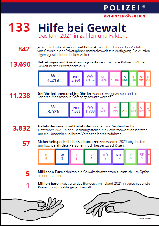 Das Bundeskriminalamt unterstützt aber auch NGOs bei ihrer Arbeit: 2020 wurden zusätzlich fünf Mio. Euro für Gewaltschutzzentren und Interventionsstellen in ganz Österreich ausbezahlt. Darüber hinaus wurden unterschiedlichste Gewaltpräventionsprojekte in Österreich mit einer Mio. Euro unterstützt.